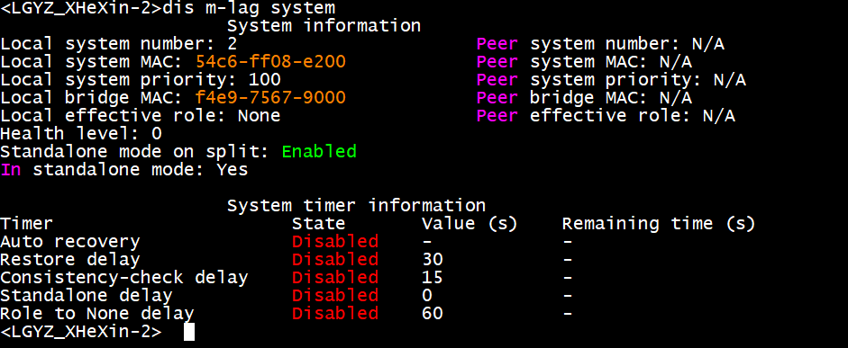 客户现网有一台核心设备,新采购了两台S7506X-G,两台新设备组M-LAGvrrp,要替换掉旧核心设备。方案是先把备机上架加电运行,旧核心业务先移至备机,然后在新的主设备加电运行,备机业务在移回主设备。操作中发现,备机上架加电后,业务接口连接终端后不UP,只有管理口up。把业务接口用mad 排除掉也不行。查看m-lag系统细心显示设备角色为none,这怎么办才能让业务接口up?在主设备不启动的情况下。