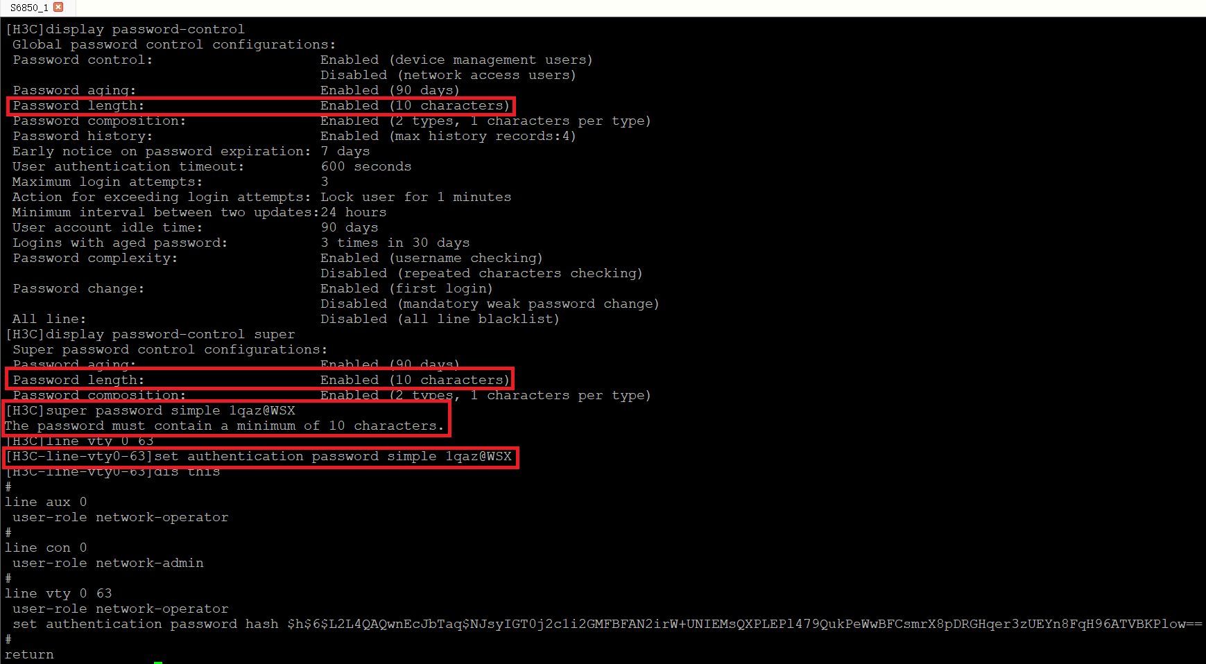 开了password-control,密码长度要求最短为10,但我在line vty下用password方式配置了一个长度只有8的密码,说明它根本就无视password-control。