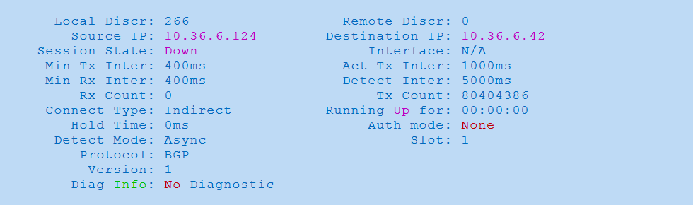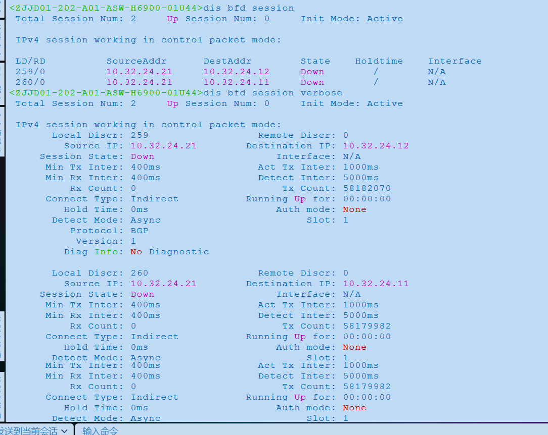 请教bfd down排查过程,interface N/A   或者路由协议 session state down 或者ipv6down等