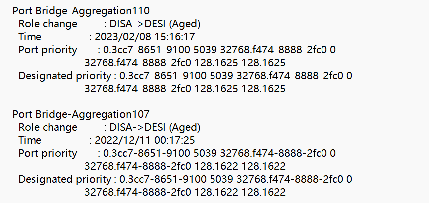 %Feb 8 15:15:45:612 2023 ISW-VM-G1-1.AM29 STP/6/STP_DISCARDING: Instance 0's port Bridge-Aggregation106 has been set to discarding state.