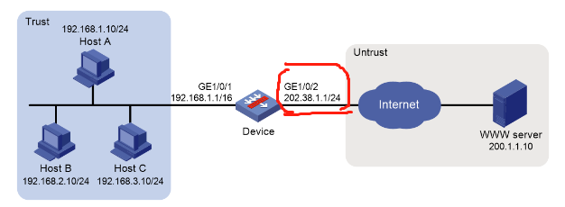 防火墙做nat的时候,一般是用连接公网的地址做转换,如图会使用202.38.1.0/24这个段,有没有可以不用202这个网段的,而使用其他的公网地址,比如用100.1.1.1和100.1.1.2做 nat address-group 1