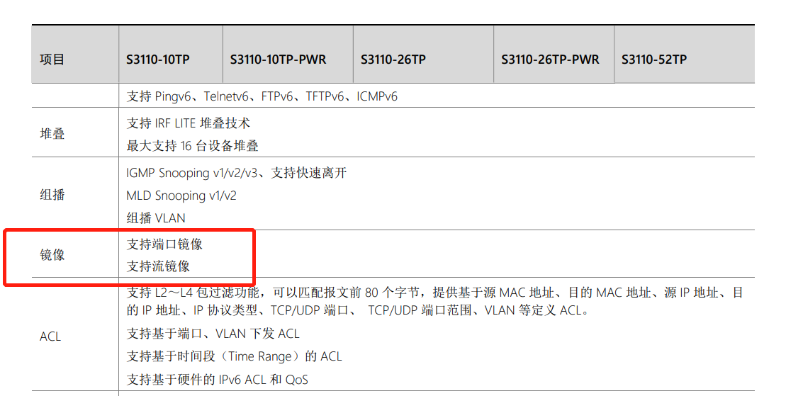 你好 咨询一下HS3 S 3110 Series 交换机具备镜像功能不具备?