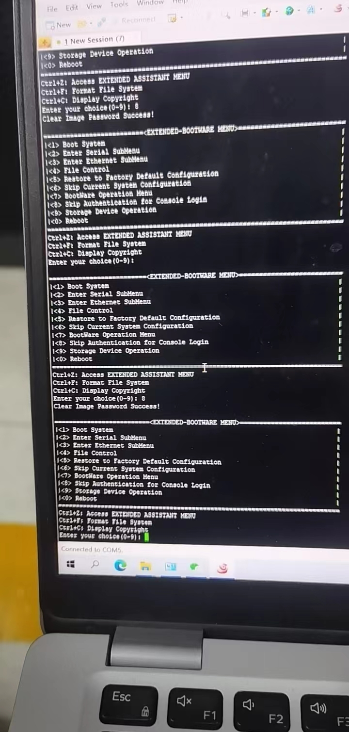 h3c交换机S10508忘记console口密码了。重启选择ctrl+B进入bootware menu,选择8 Skip current system configuration。但是他不会出现Y/N,就好像没用一下。