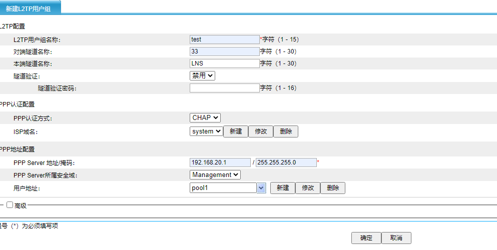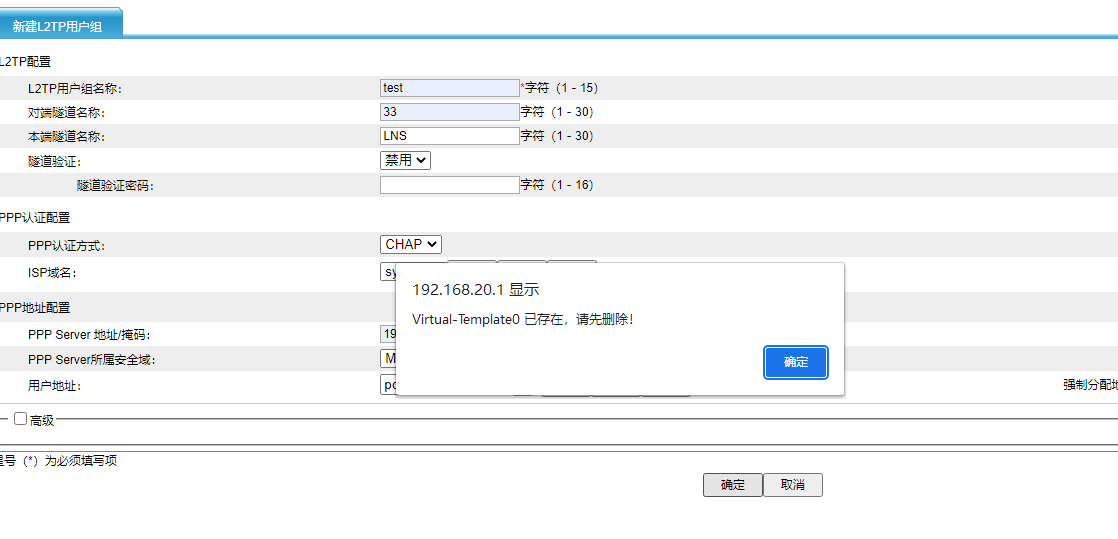 SecPath F100-E-G 设置VPN L2PT不能新建用户组 设备IP是192.168.20.1,设备用固定IP出外网,内网IP段192.168.20.1-192.168.20.254 。