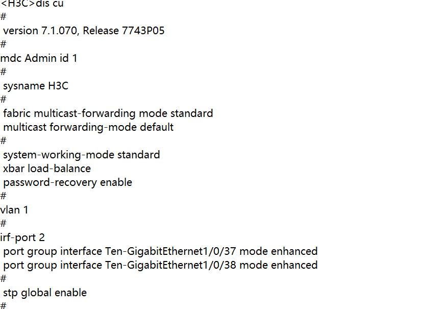 这是备机已经起来了的 system-working-mode standard xbar chassis 2 load-balance password-recovery enable # vlan 1 # irf-port 2/1 port group interface Ten-GigabitEthernet2/1/0/37 mode enhanced port group interface Ten-GigabitEthernet2/1/0/38 mode enhanced