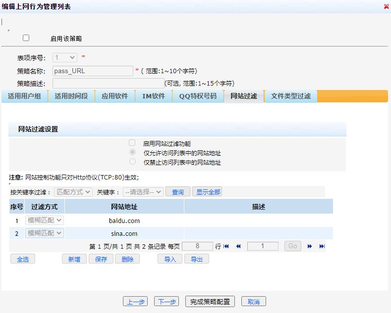 ER8300G2-X路由器 --行为策略管理->上网行为管理->网站过滤 设置只通过指定网站时
