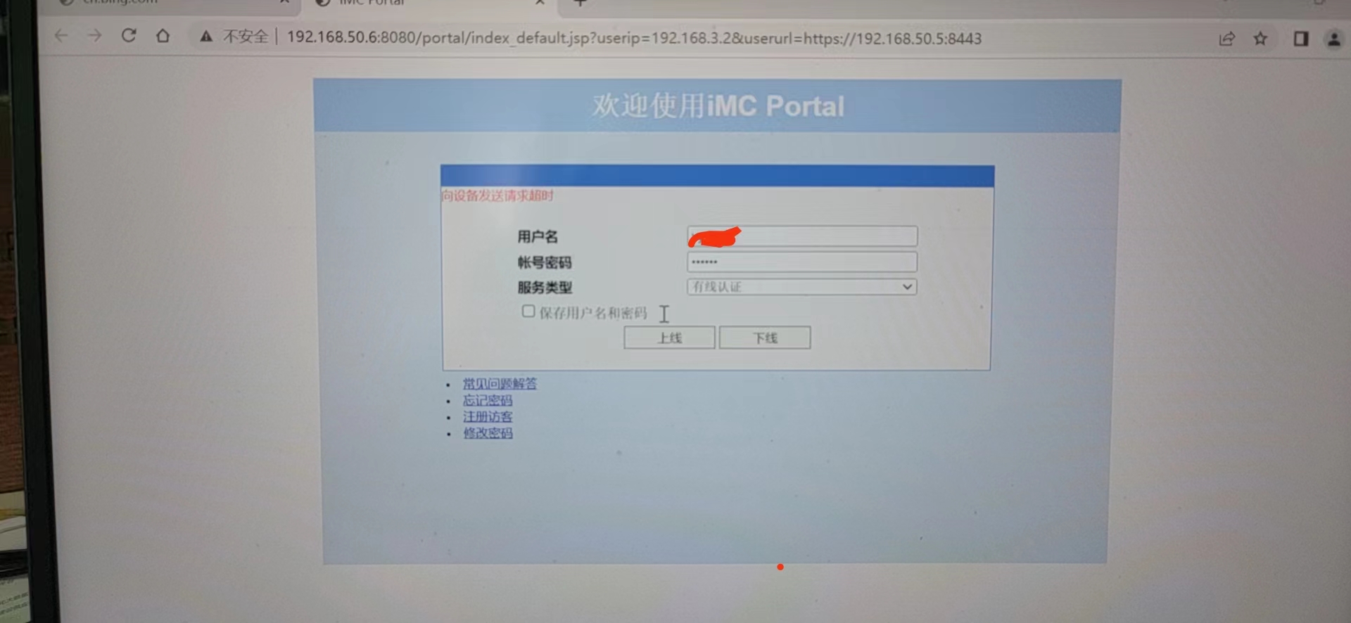 在IMC中配置好接入设备、策略、服务、用户及PORTAL相关参数,用户端能获取到IMC PORTAL认证的页面,但是出现“向设备发送请求超时”