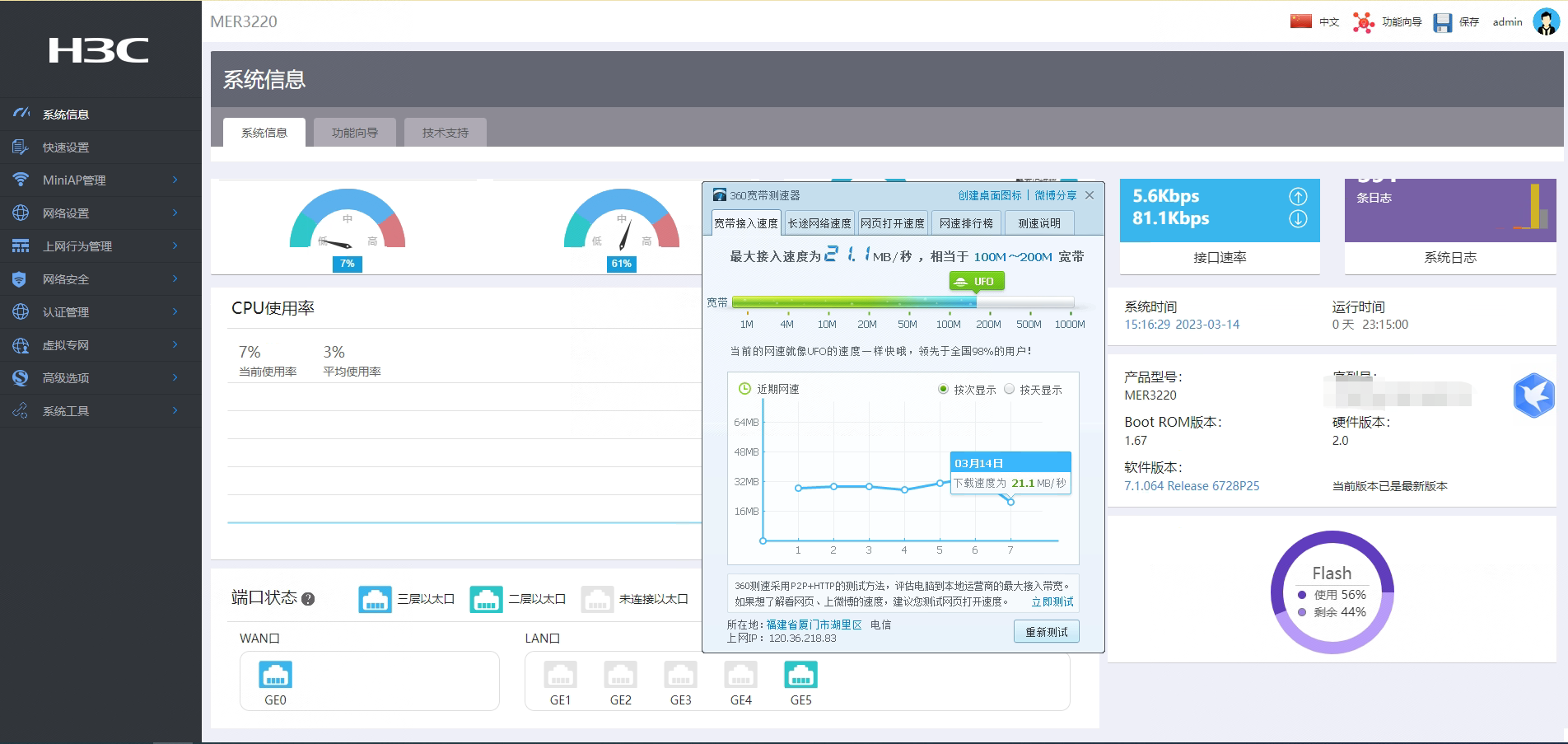 处理方法:在设备Web管理页面的导航栏中选择“系统信息页面”,查看路由器的CPU利用率和内存利用率。