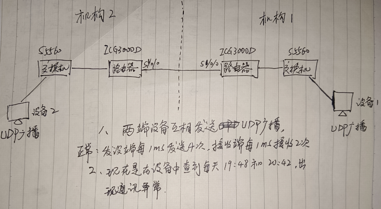 如上图所示,两个地方的设备需要分别给对端发送UDP广播,目前在设备上查到某个特定时间会出现通讯故障,请问是路由器或者交换机的哪些配置有关系吗?请大神指导!!!