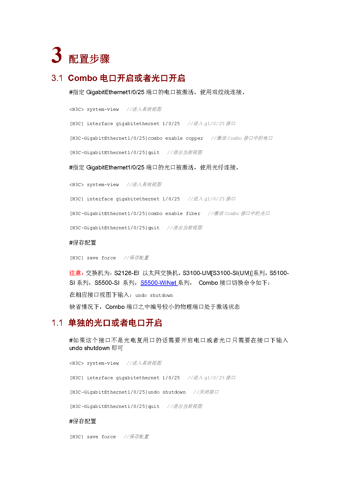设备是h3c S5500今天想接光模块,可是四个光口都不亮,估计是关掉了。