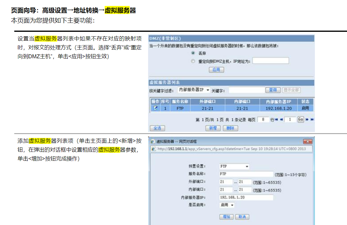 为保证局域网的安全,路由器会阻断从因特网主动发起的连接请求。因此,如果您想让因特网用户能够访问局域网内的服务器(比如:Web服务器、Email服务器、FTP服务器等),需要设置虚拟服务器。