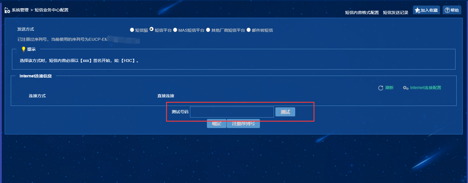 1、在iMC的系统管理--系统配置--短信业务中心配置下重新配置亿美序列号,并点击该页面的确定按钮,确保配置无误且生效