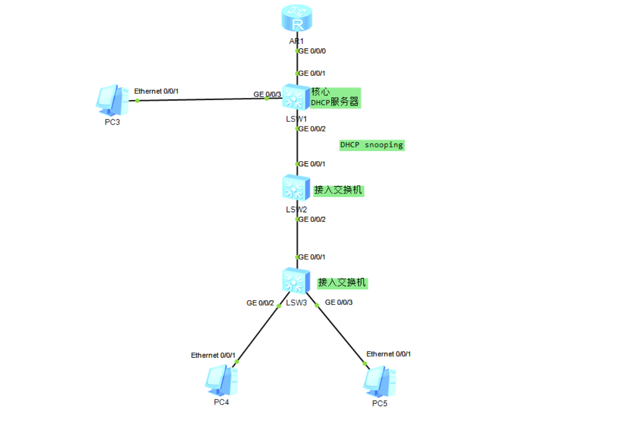 要求: 与合法DHCP服务器相连的端口可以转发DHCP服务器的响应报文,而其他端口不转发DHCP服务器的响应报文。记录DHCP-REQUEST报文和信任端口收到的DHCP-ACK报文中DHCP客户端IP地址及MAC地址的绑定信息。