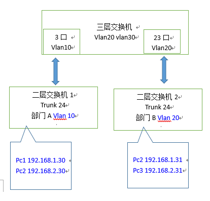 网关都在三层交换机的话,两个vlan是有直连路由的,可以直接通。但是你的配置有点问题,可以这样修改,三层交换机的3口和23口改为trunk,且允许vlan 10 20 通过,二层交换机的trunk口,也需要允许vlan 10 20 通过,