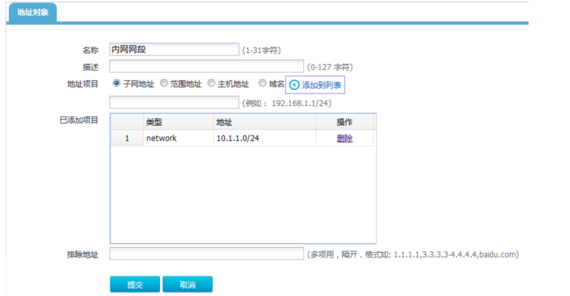 #点击“对象管理”>“地址”>IPv4地址对象”,点击“新建”。IP地址配置为10.1.1.0/24,创建内网网段地址对象