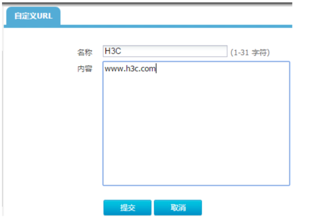 #点击“对象管理”> URL> “自定义URL”,点击<新建>,配置自定义URL对象H3C内容配置为www.h3c.com,点击<提交>