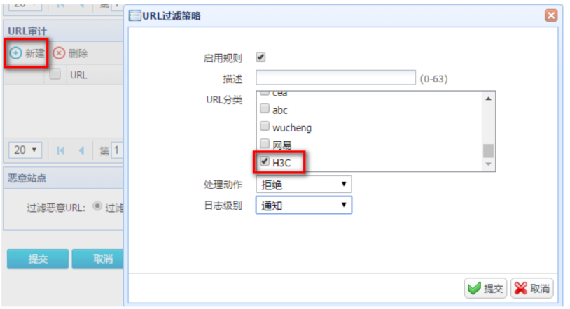 #点击URL审计下方的“新建”,在URL分类中选择创建的网易,处理动作选择拒绝,日志级别选择信息。
