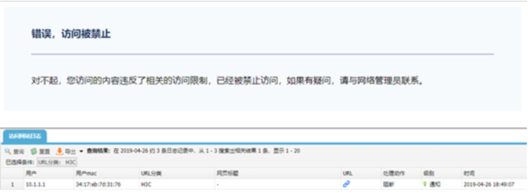配置完成后在PC上访问H3C官网,web界面显示访问被禁止,并且日志中有匹配的记录。