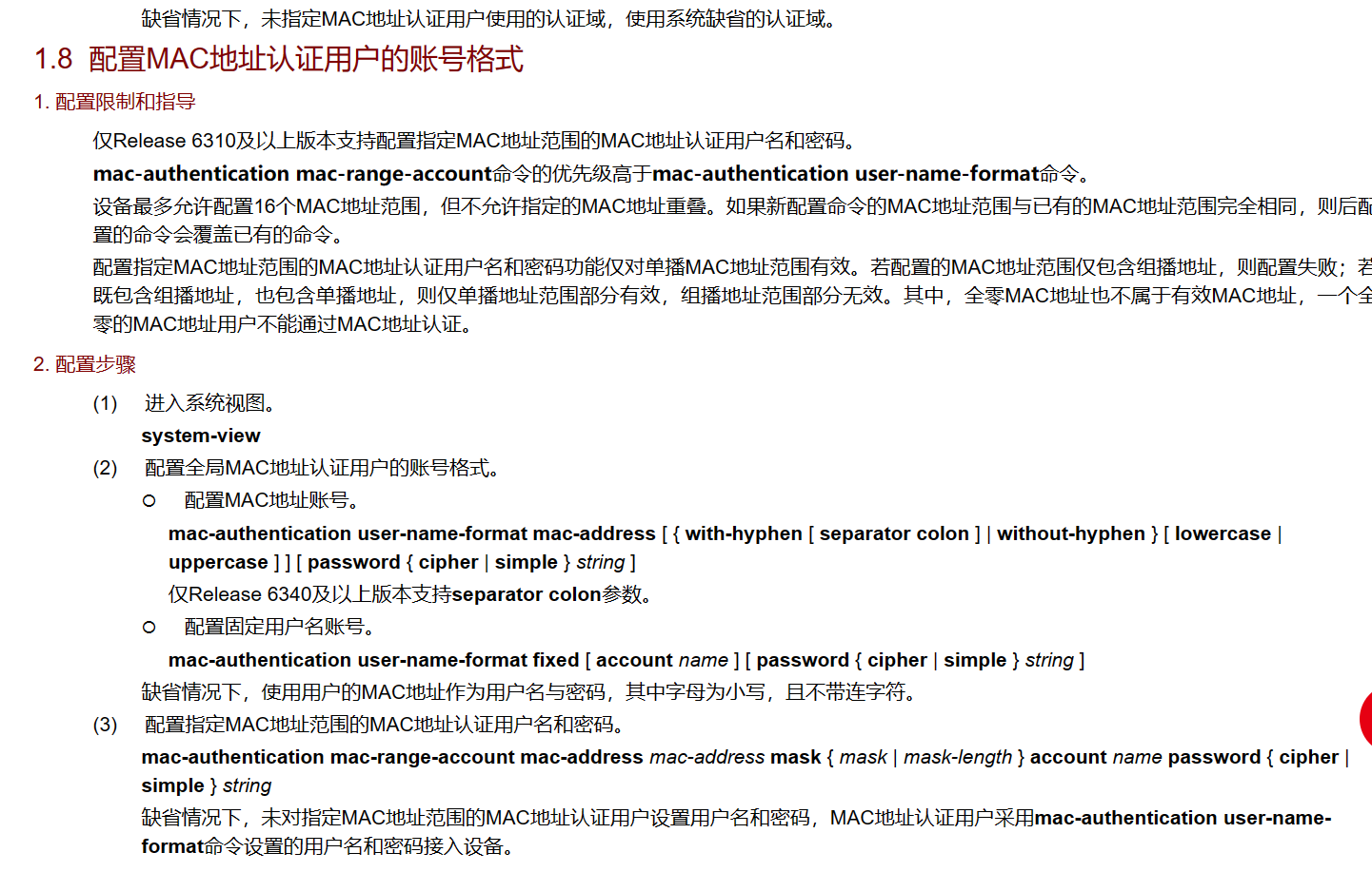若指定用户的MAC地址为用户名,则用户密码也为用户的MAC地址。这种情况下,每一个MAC地址认证用户都使用唯一的用户名进行认证,安全性高,但要求认证服务器端配置多个MAC形式的用户帐户。