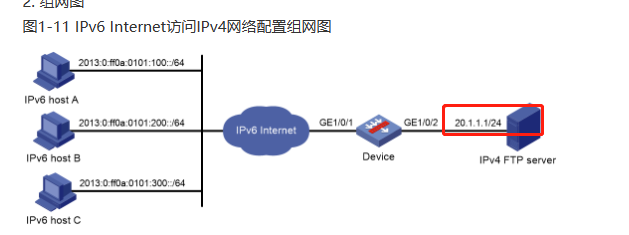 · 通过IPv4到IPv6源地址静态转换策略,为IPv4网络中的FTP服务器地址指定一个对应的IPv6地址,IPv6 Internet中的主机通过访问该IPv6地址可以访问IPv4网络中的FTP服务器。Device收到发往该IPv6地址的报文时将其目的地址转换为对应的IPv4地址。