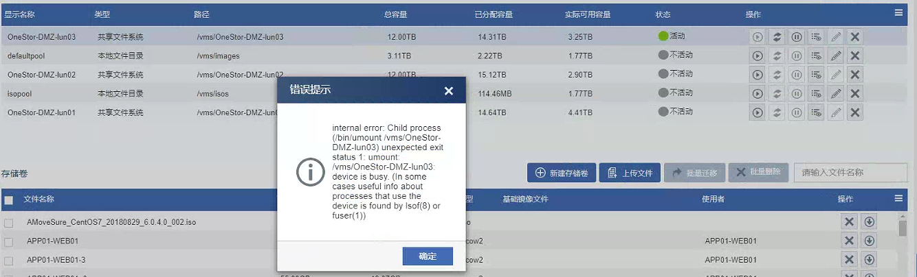 执行lsof +D /vms/ LUN_9000_01_FSAS_DATA1后发现有kvm进程运行,执行kill指令杀掉进程,在cas前台暂停存储卷成功。