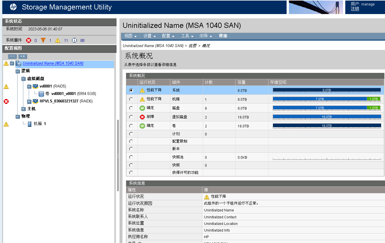 兄弟,你那SMU截图里显示着2个虚拟磁盘,一个叫vd0001,它是RAID5,这个虚拟磁盘没事。另外一个叫HPVLS什么的,它是RAID6,现在是隔离状态QTOF,它的数据现在是不可访问的~