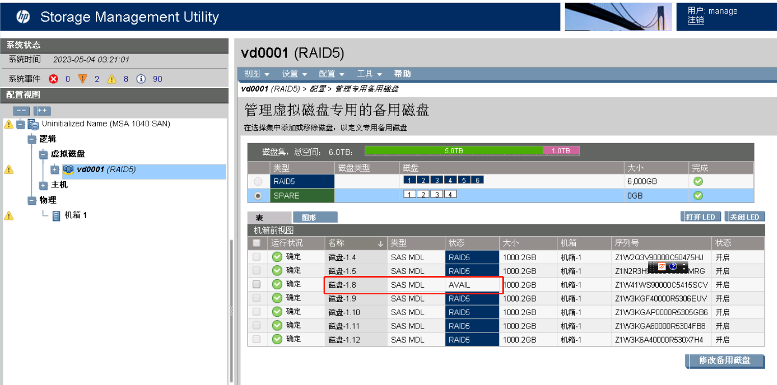 我们采用的是raid5+备,中间我们硬实冷启动过一次。因为硬盘灯不亮。