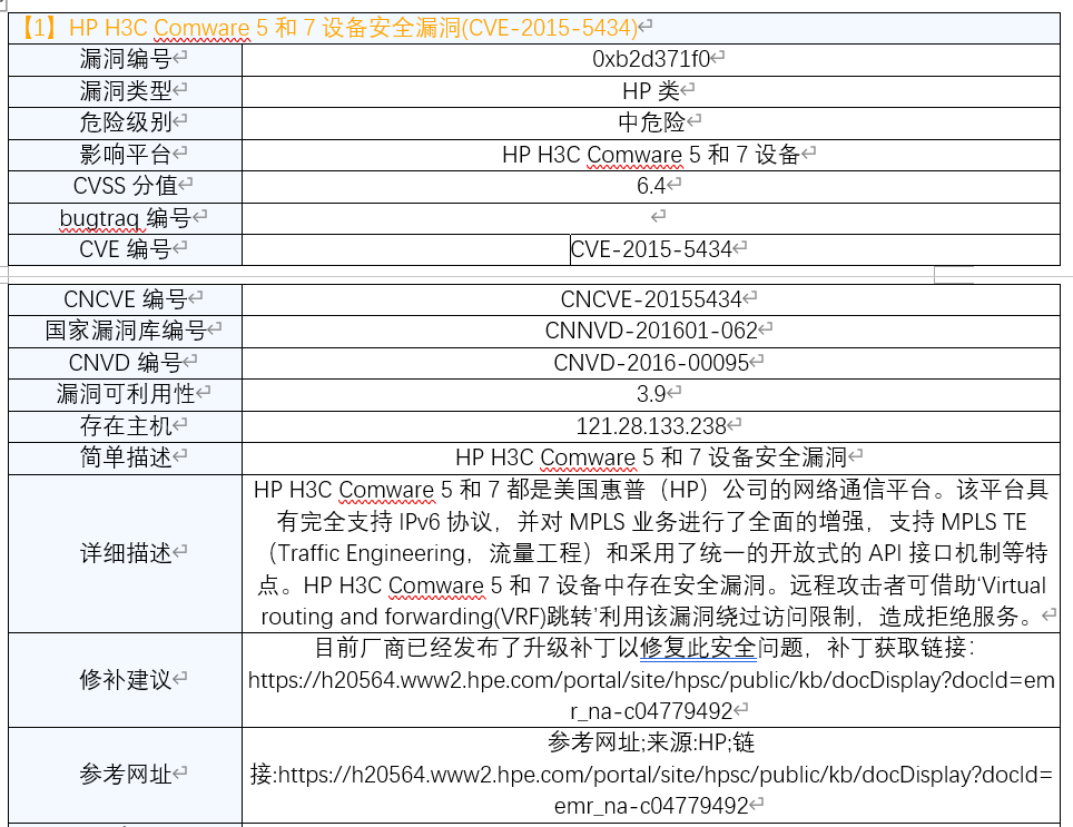 针对未开启MPLS时漏扫设备仍然能扫描出漏洞的情况,这个漏洞的扫描是单纯的根据设备返回的旗标(即返回的Comware7.1.064)信息进行判断,并没有根据漏洞原理进行扫描,分析为误报