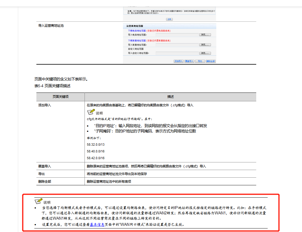 当您选择了均衡模式或者手动模式后,可以通过设置均衡路由表,使访问特定目的IP地址的报文按指定的链路进行转发。比如:在手动模式下,您可以通过导入新联通的均衡路由表,使访问新联通的流量都通过WAN2转发;然后再指定缺省链路为WAN1,使非访问新联通的流量都通过WAN1转发,从而达到不同运营商流量在不同的链路上转发的目的。