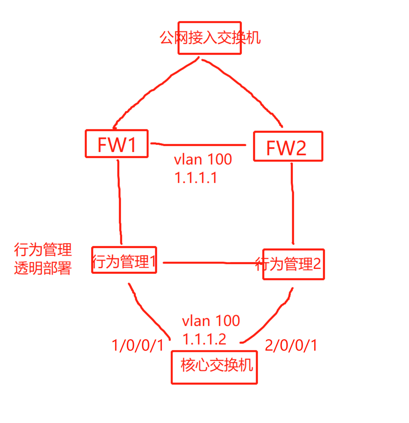 1、防火墙堆叠,上行使用的reth接口分别对应两个物理接口。 下行使用两个接口划入vlan100与行为管理互联。防火墙的上行口与下行口做了接口联动组,上行端口down则下行端口同步down掉。