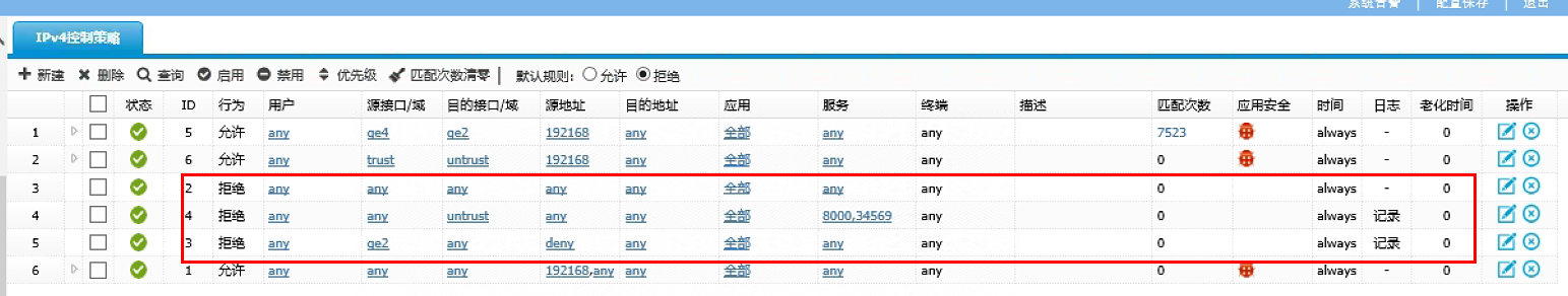 拒绝策略好像都不会生效?服务端口阻断不了?服务-端口号34569 测试不生效,如果第一条全部拒绝放最前面,测试34569这端口也还是不生效?