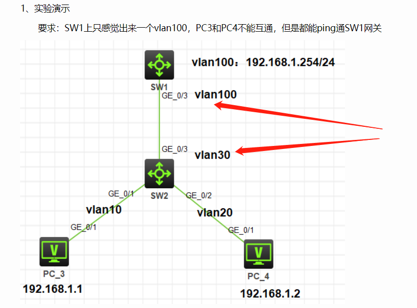 SW1和SW2互联接口都不在一个vlan,怎么通信呢,官方教材也是采用一个vlan10 和vlan20.怎么通呢