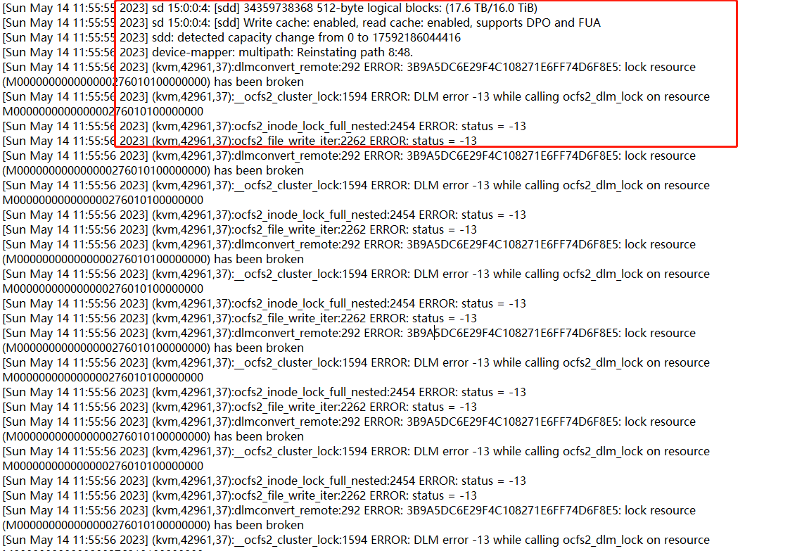 现场出现一台CVK 触发fence导致虚机整体异常重启迁移,且处于ONEStor的物理卷均出现不同程度的异常,cvk显示异常日志如下: