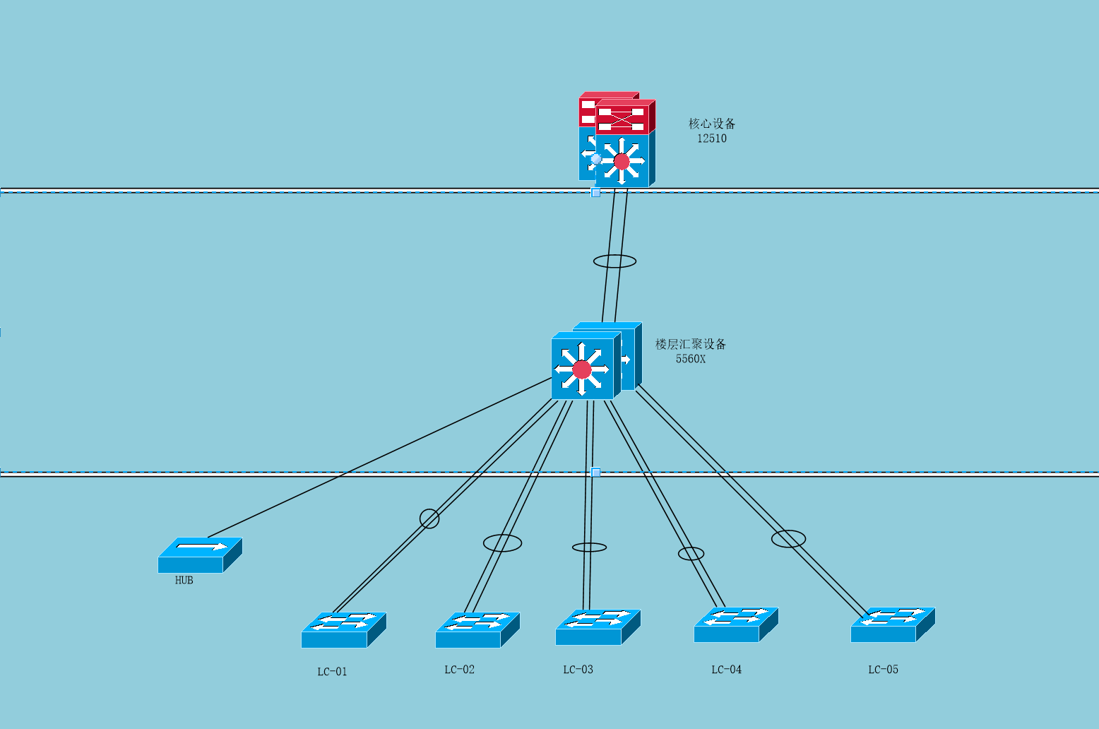 组网模式基本如下,由于接入交换机接口不够,网内存在很多hub,汇聚也都有接入终端设备