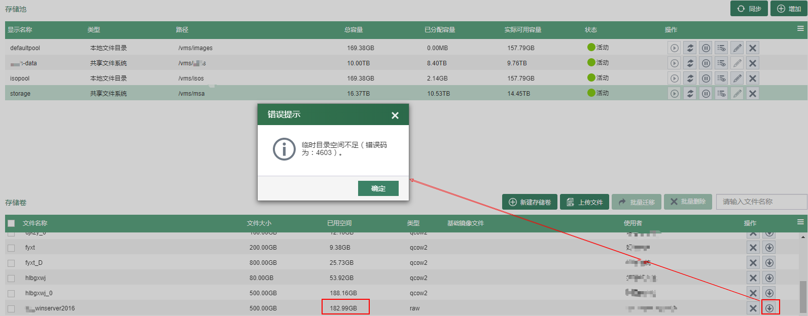 CAS云计算管理平台,版本:V5.0 (E0526)。在存储卷里下载镜像文件时提示“临时目录空间不足(错误码为:4603)。”如图: