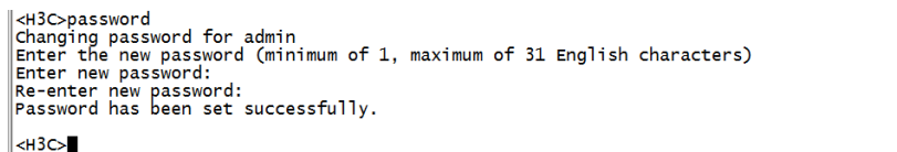 使用Consosle口登陆设备,参考【01设备管理】章节中的【1.1.1 Console方式登录设备方法】<H3C>提示进入设备命令行,输入password命令并回车,按照系统提示,提示:enter new password(输入新密码),则可以直接输入新密码,并重新输入一次确认即可。