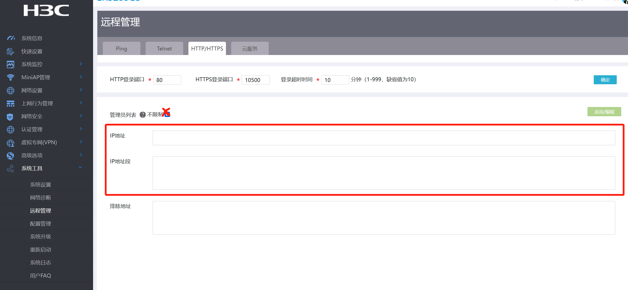 可以配置远程管理的源地址,如果是限制外网需要配置防火墙功能