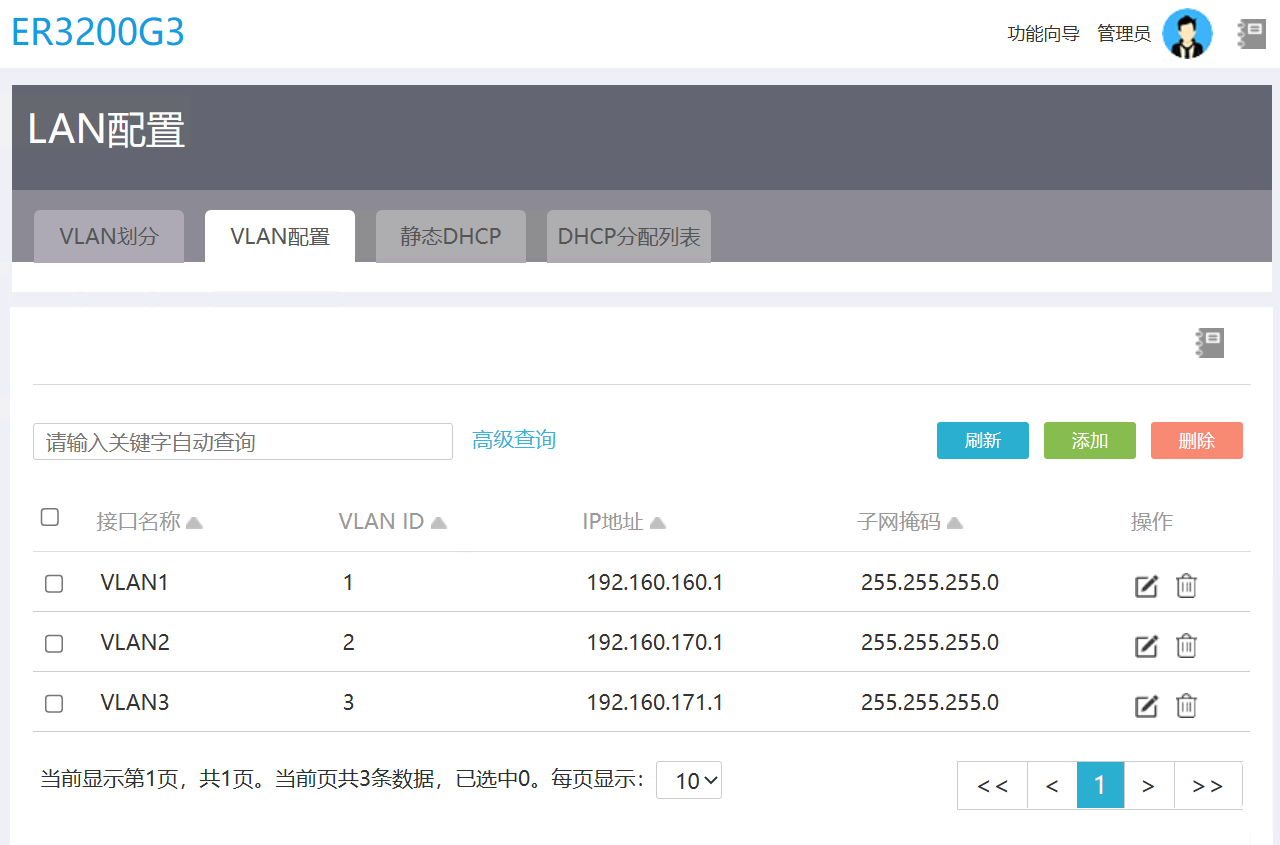 ER3200G3-【LAN配置】-【VLAN配置】,已经添加了192.160.160.1 ,192.160.170.1 ,192.160.171.1 ,三个IP地址段,【VLAN划分】里LAN1已经把VLAN1 、VLAN2 、VLAN3允许通过的VLAN,但是PVID为1的时候,只有192.160.160.1能上网,PVID为3的时候,只有192.160.171.1能上网,配置如下图