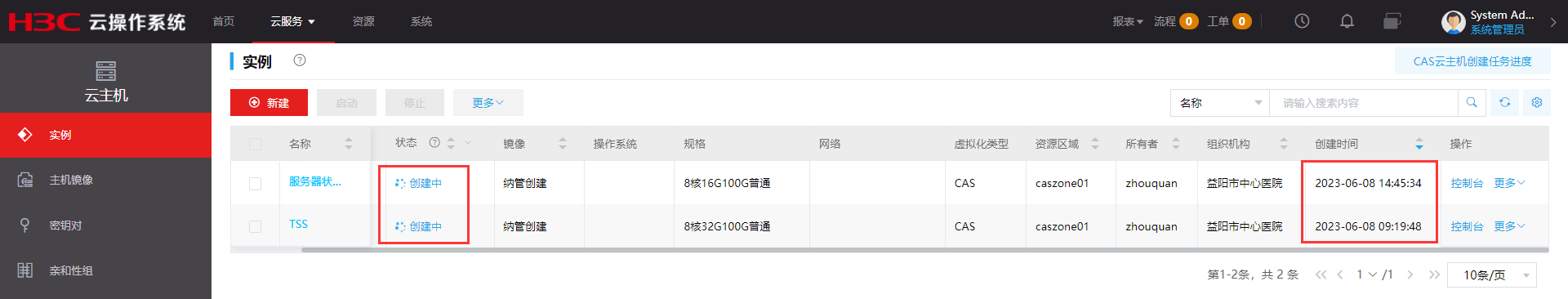 如果没搞混,那提问就是2个问题,裸金属的问题如上;CAS虚拟机纳管一直创建中可能原因太多了,最直接的是找计算节点/var/log/nova/nova-compute.log看日志,其他可以参考新建失败的这个云图:https://zhiliao.h3c.com/Theme/Chart/1205