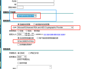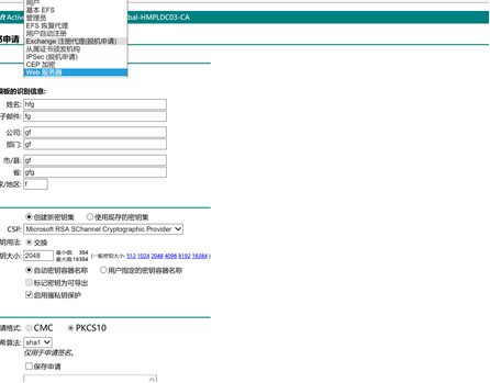 现在有一个问题,模板都是选的Microsoft Enhanced RSA and AES Cryptographic Provider,但是现在下拉框中无此选项,这是怎么回事呢?这是不是导致不能选CMC的原因呢?