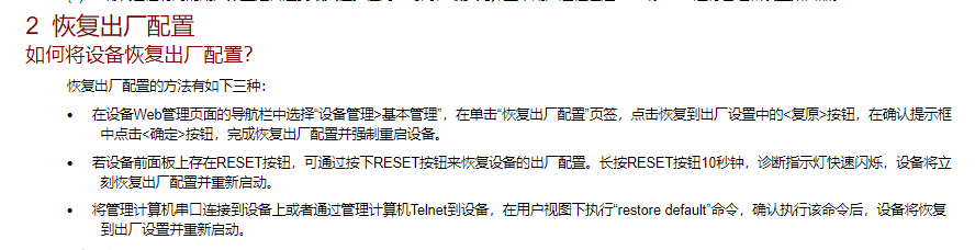 输入restore default命令并回车,确认后,路由器将恢复到出厂设置并重新启动。