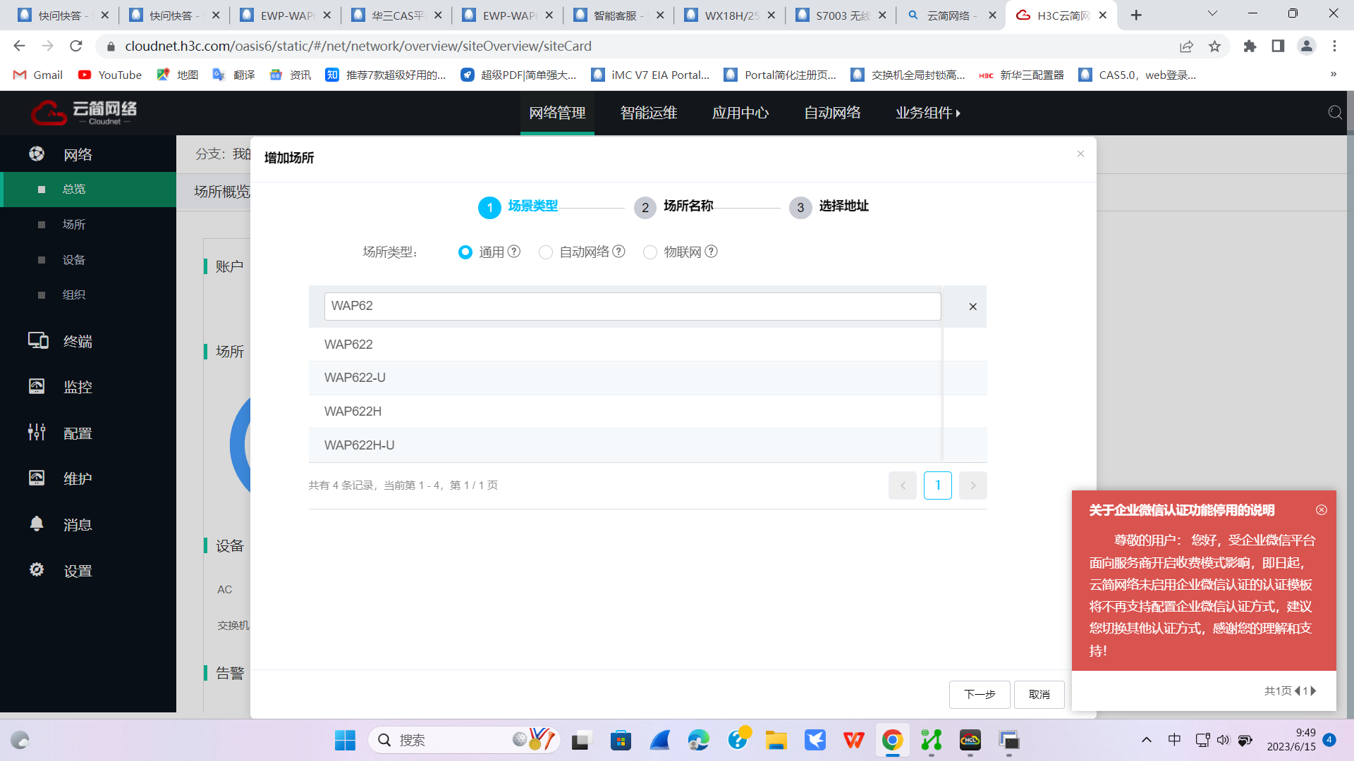 两种AP一种型号为EWP-WAP622-FIT,一种为EWP-WAP622H,在云简网络中场所用的通用型,在添加设备时622H可以添加,但622-FIT无法添加,提示“设备类型和场所不匹配”