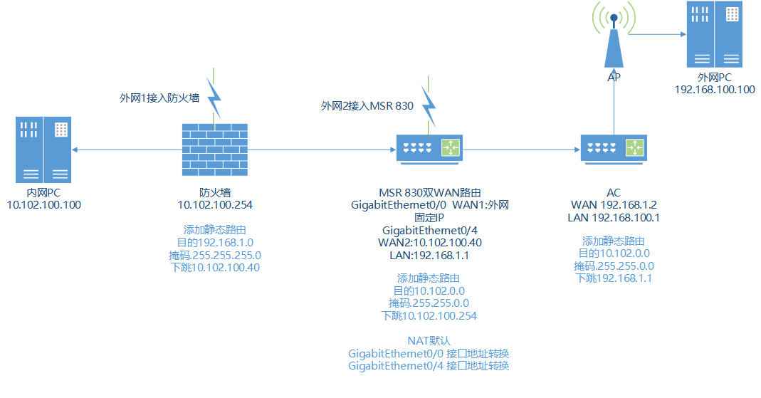 局域网拓扑图如下,目前通过外网PC192.168.100.100可以访问到内网PC 但是内网PC无法往回访问,目前排查下来是如果把MSR830的NAT “GigabitEthernet0/4 接口地址转换”删除之后可以从内网PC PING通MSR 830(192.168.1.1)和AC(192.168.1.2)但是无法PING通AC下的192.168.100.100 而且删除了这条地址转换之后网络会很卡 无法正常使用 有大佬解救一下吗
