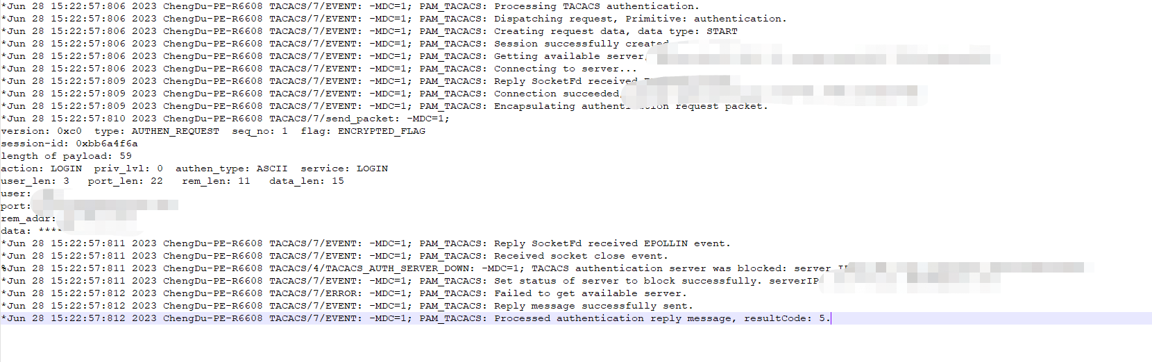 设备配置已完成,设备deug显示如下。hwtacacs账户无法登入