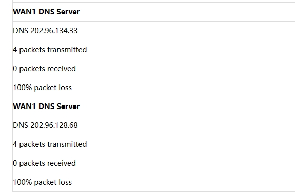 电信配置的固定IP,自检DNS100%丢包率,改了114的也不行,原来正常在用 。