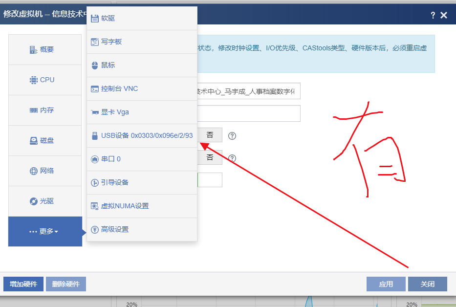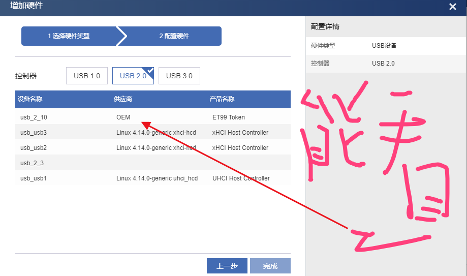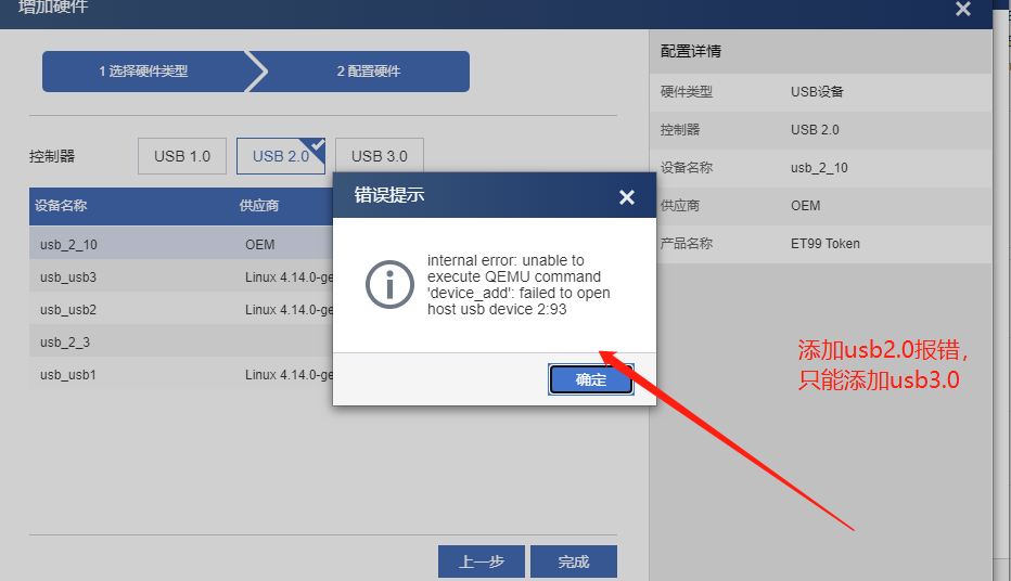 添加usb能看到到加密狗usb,usb2.0报错,我选择添加usb3.0,成功