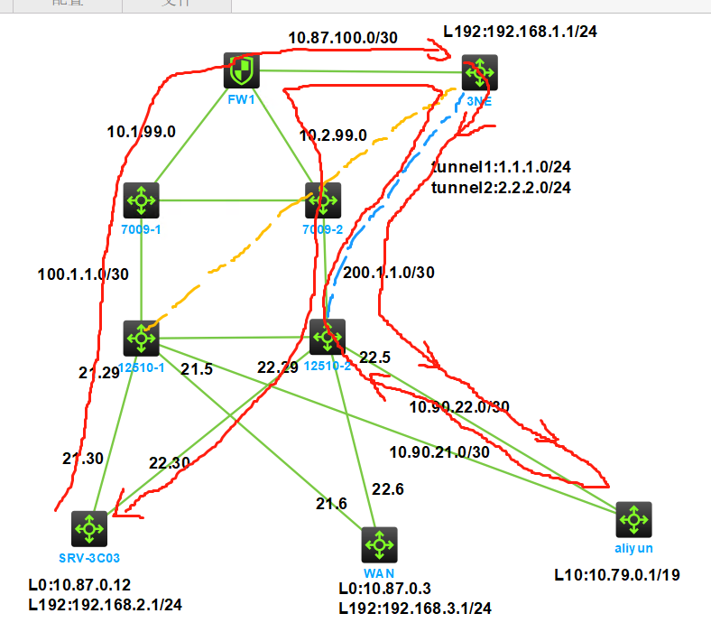 3C03——12510-1——7009-1——FW——3NE——gre tunnel 2(这里很奇怪,分别写静态路由走tunnel1,tunnel2,优先级一样,但测试结果直走tunnel2)——12510-2——aliyun(这里也很奇怪,aliyun写2条缺省路由分别指向12510-1,12510-2,优先级一样,但抓包发现没有流量去12510-1)——然后沿着图中的红色线走——到达防火墙后流量竟然只给到7009-2(此处防火墙写2条缺省路由,分别指向7009-1,7009-2,优先级一样)——最终流量从12510-2回到3C03。