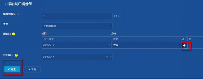 3) 镜像组编号填写1”,类型为“本地镜像组”,源端口为GE1/0/10GE1/0/11,方向都是双向,选中接口之后点击“+”表示添加,目的端口为连接Server的端口GE1/0/12,然后点击“确定”。
