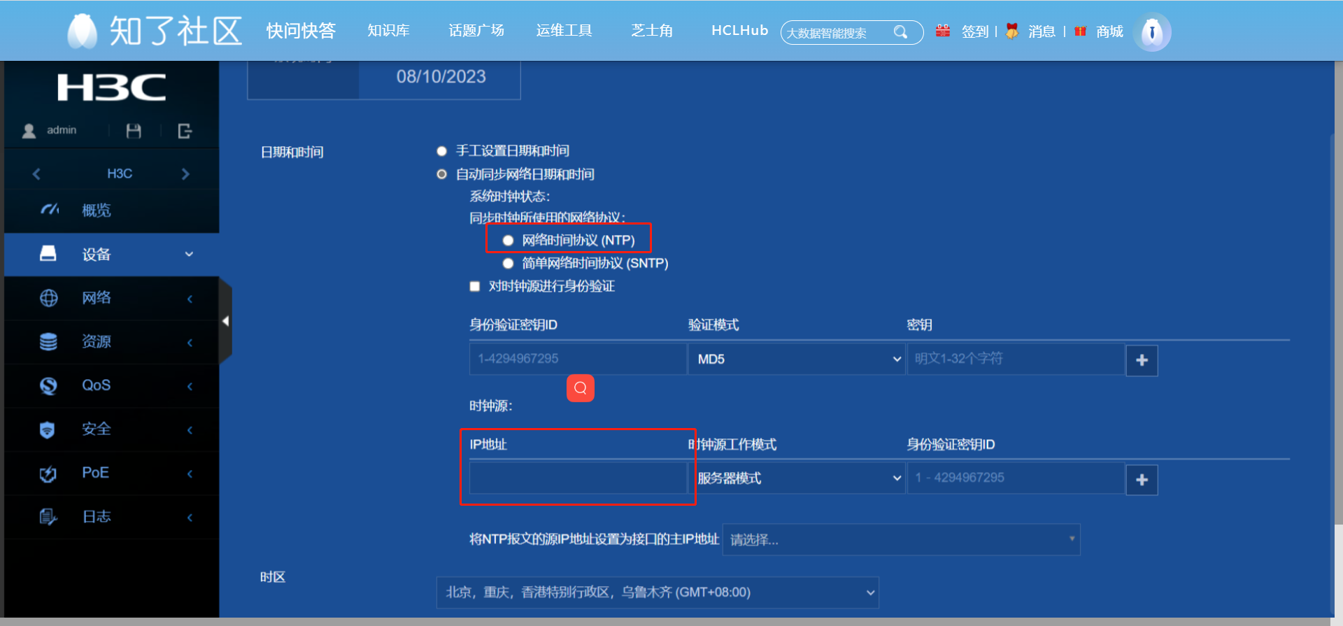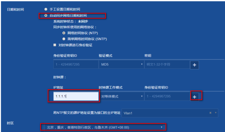 选择自动同步网络日期和时间,输入NTP服务器的ip地址,点击“+”添加,选择时区为北京时区,和NTP服务器选择同一个时区。