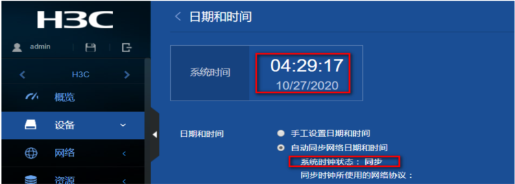 (1)在导航栏中选择“设备> 系统设置> 日期和时间”查看当前时间已与NTP服务器同步,系统时钟状态为同步。
